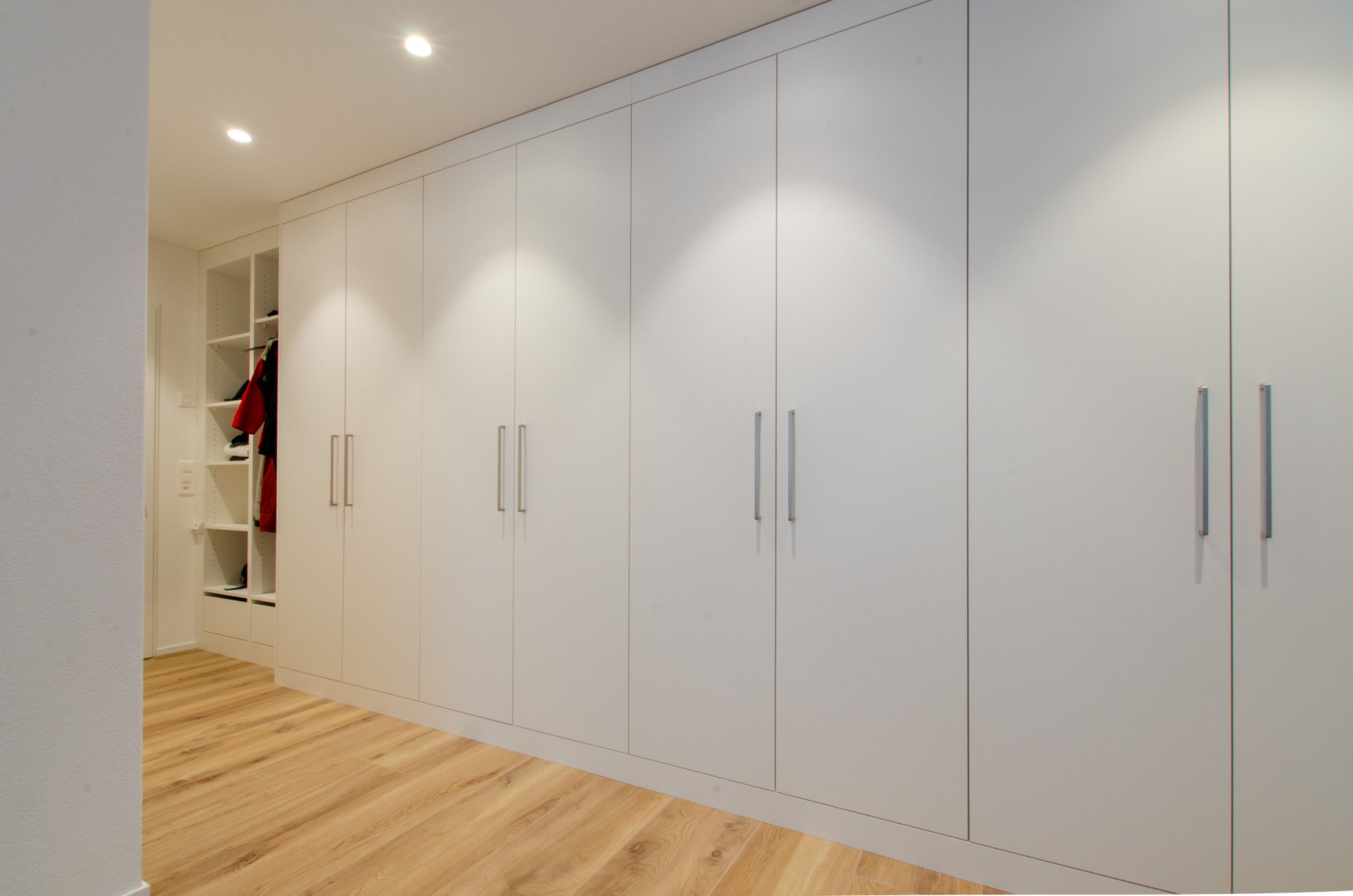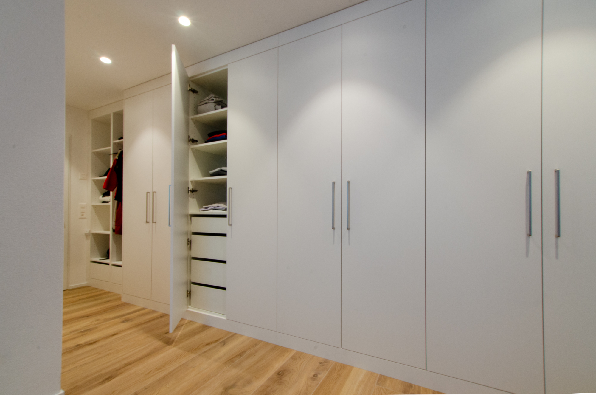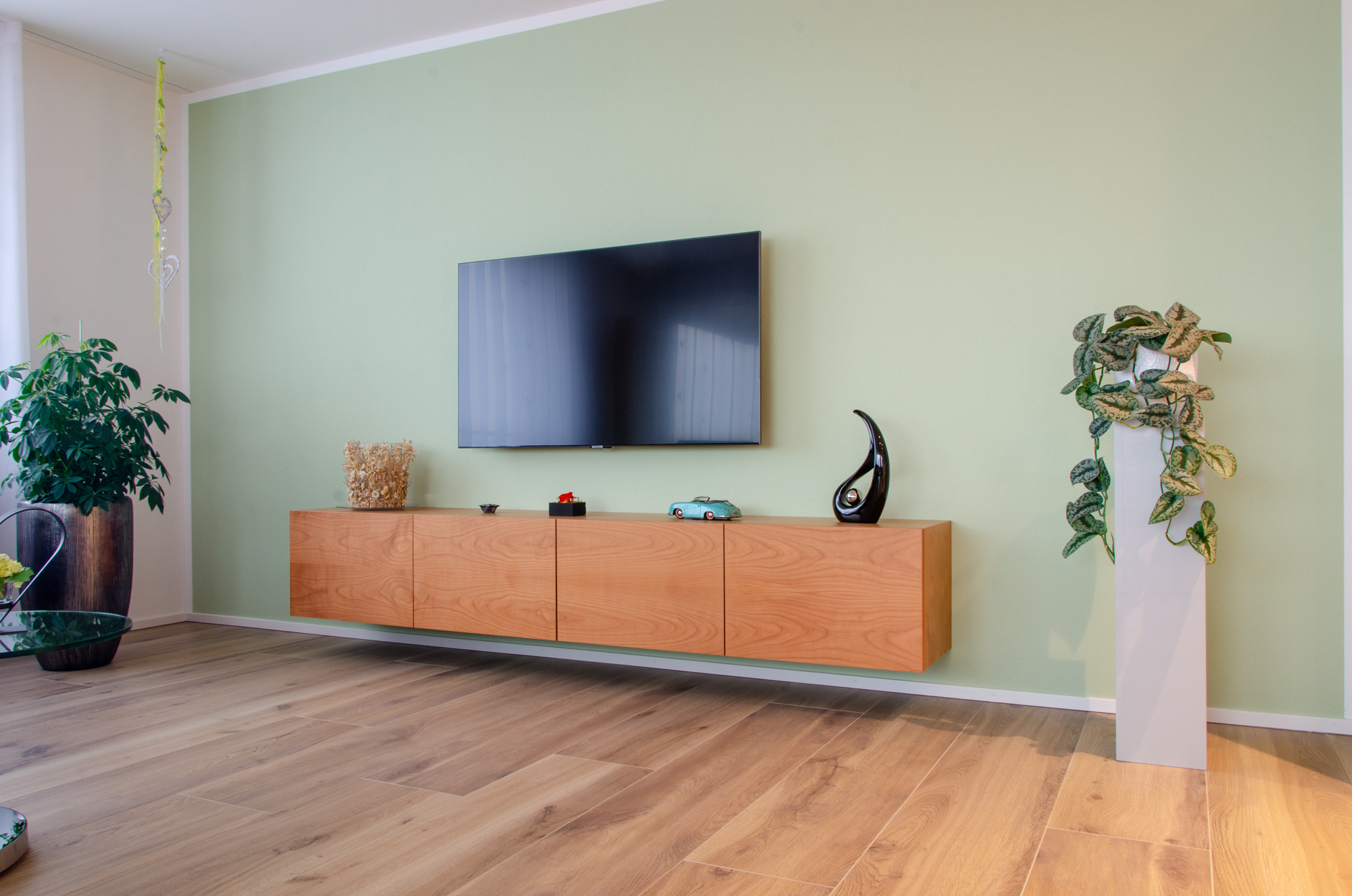 Für unsere Kunden in Wil durften wir ein modernes Fernsehmöbel und einen grosszügigen Ankleide-Schrank realisieren. Das schlichte, in Kirschbaum furnierte Möbel verstaut die Technik sauber und unsichtbar. Der Schrank bietet mit vielen Schubladen optimale Einteilungsmöglichkeiten.